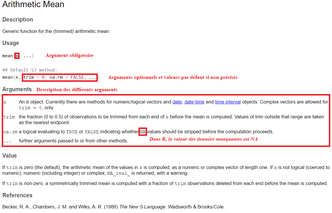 Grâce à ce fichier d’aide en anglais, on peut obtenir une description de la fonction et voir qu’il y a trois arguments/paramètres pour la fonction mean: