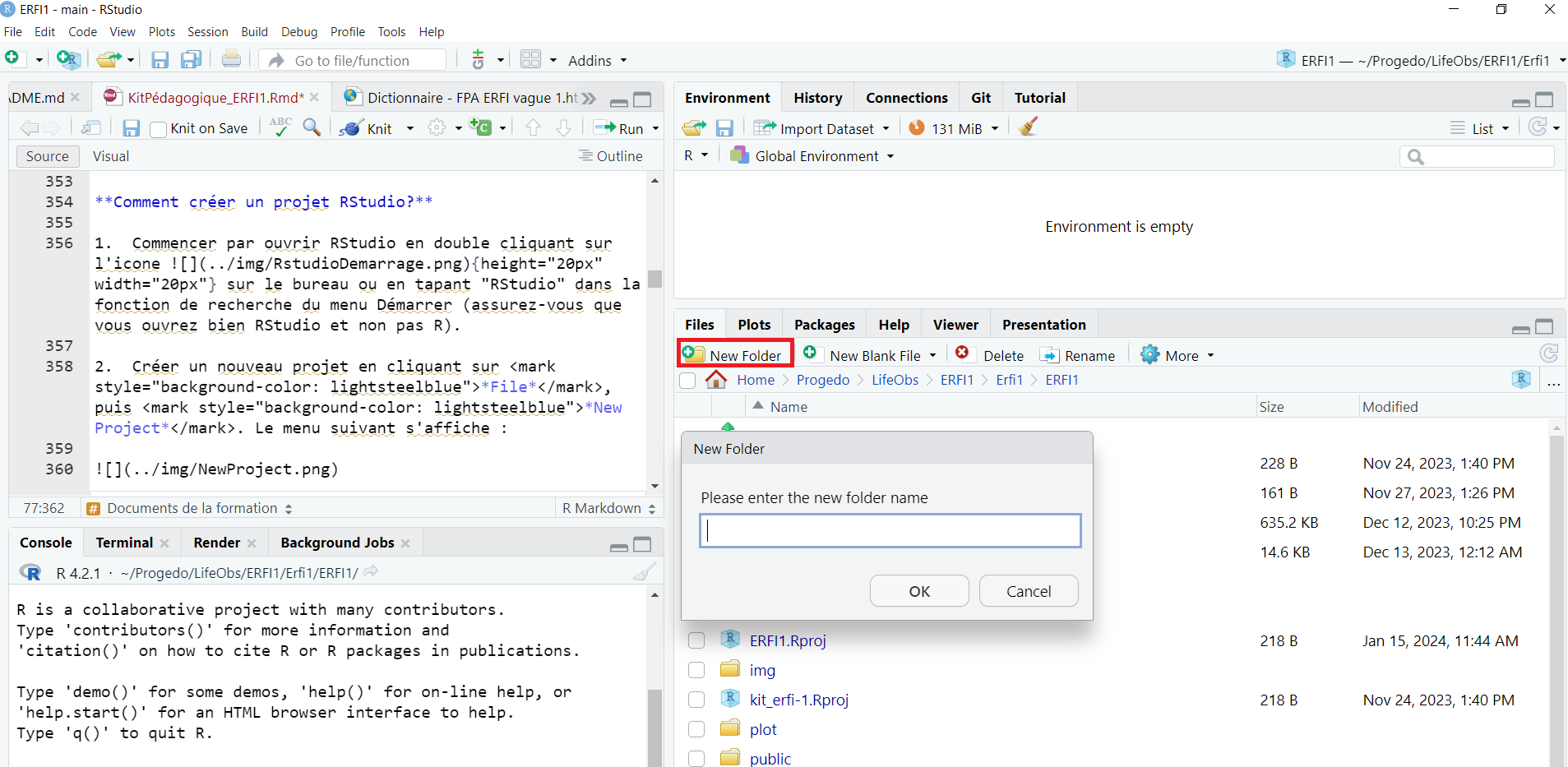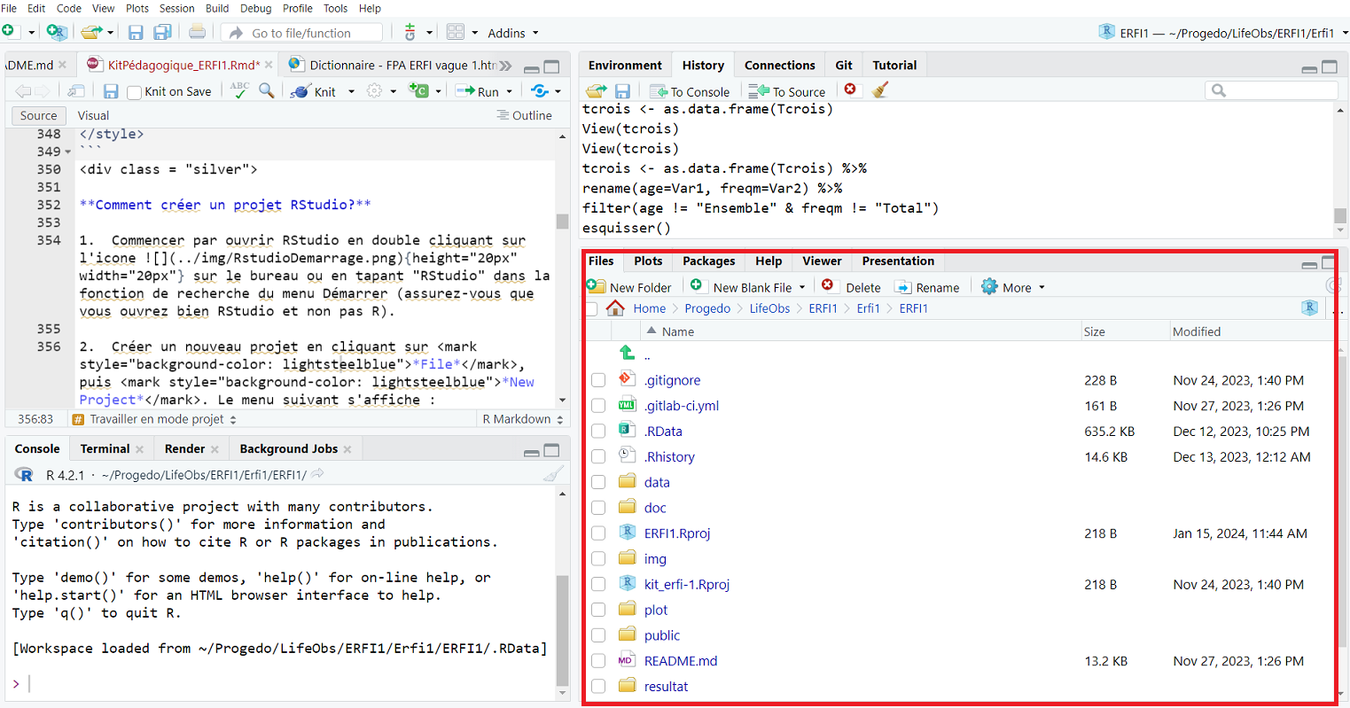Un projet RStudio sert à organiser son travail et facilite l’accès à tous les fichiers requis pour une analyse (jeu de données, documentation, codes R, …). Dans notre projet RStudio ERFI1, les ressources et supports de la formation ont été organisés dans différents sous-dossiers (créés par l’utilisateur) visibles dans l’onglet Files du quadrant inférieur droit.