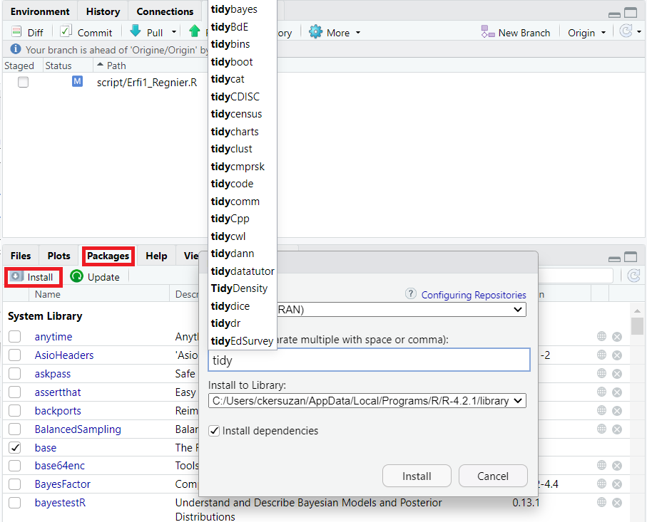 - Le téléchargement : télécharger le package sur internet, puis l’installer sur l’ordinateur, dans un dossier de R. Il y a 2 solutions pour installer un package: