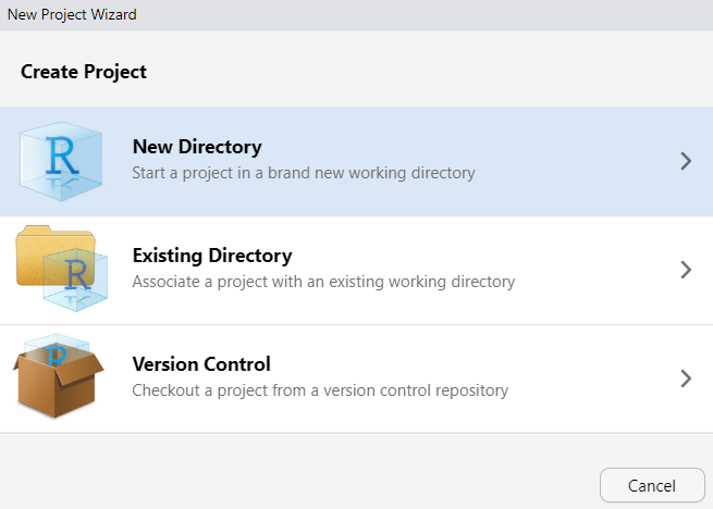 sur le bureau ou en tapant “RStudio” dans la fonction de recherche du menu Démarrer(assurez-vous que vous ouvrez bien RStudio et non pas R).Créer un nouveau projet en cliquant sur File, puis New Project. Le menu suivant s’affiche :